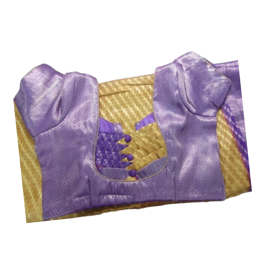 This blouse features a rich lavender silk texture with a premium shine, making it perfect for festive and wedding occasions. The highlight is the beautiful zigzag neckline patch with designer fabric button detailing, giving it a unique and elegant finish.