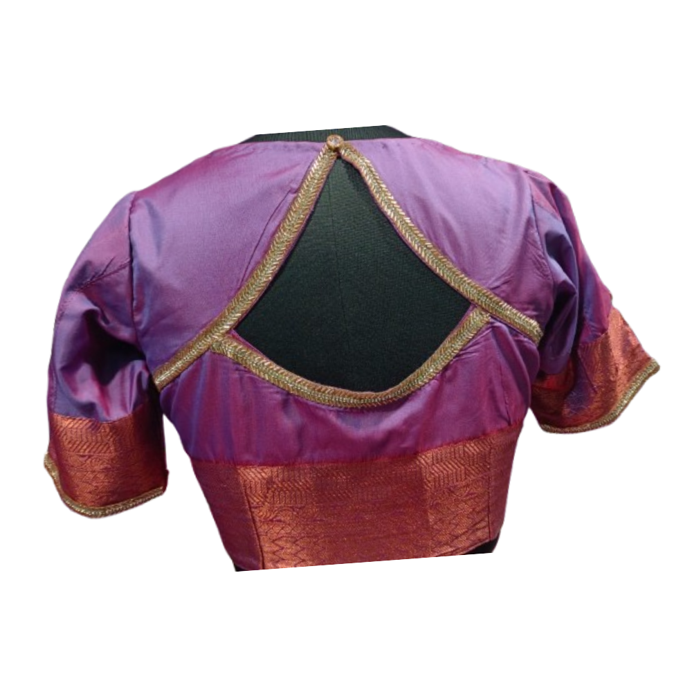 This blouse comes in a rich purple silk base with a contrasting copper zari border, giving it a timeless festive feel. The main attraction is the elegant diamond-shaped back cut design, neatly finished with zari piping, making it stylish yet very graceful for family functions.